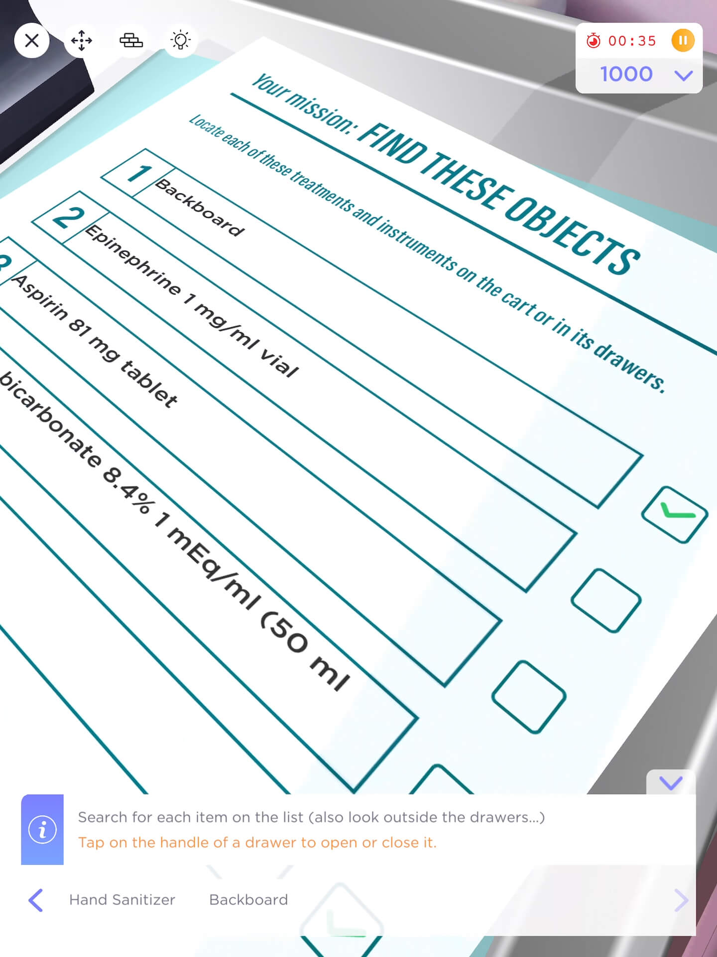 Trainees must locate the maximum number of instruments and treatments, under the pressure of a countdown timer. They lose points each time they open the wrong drawer or tap the wrong item.